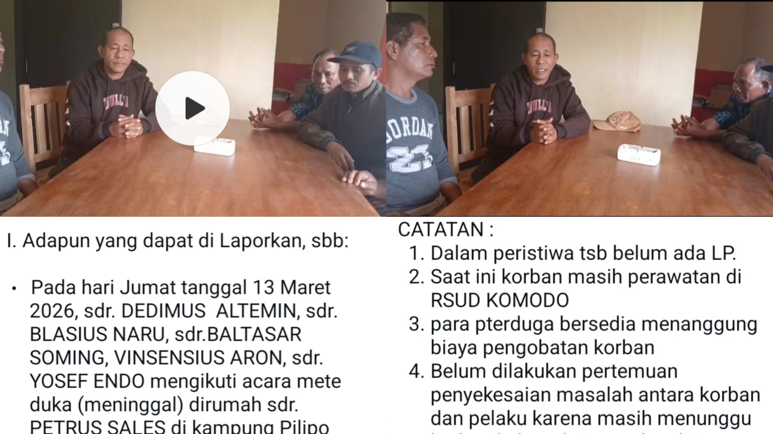 Alih-alih mendatangi korban yang terbaring di rumah sakit untuk meminta maaf secara langsung, para pelaku justru muncul dalam sebuah rekaman video berdurasi 58 detik yang dibuat di Polsek Komodo. Dalam video tersebut, Blasius Naru mewakili rekan-rekannya menyatakan permohonan maaf dan janji menanggung biaya pengobatan.