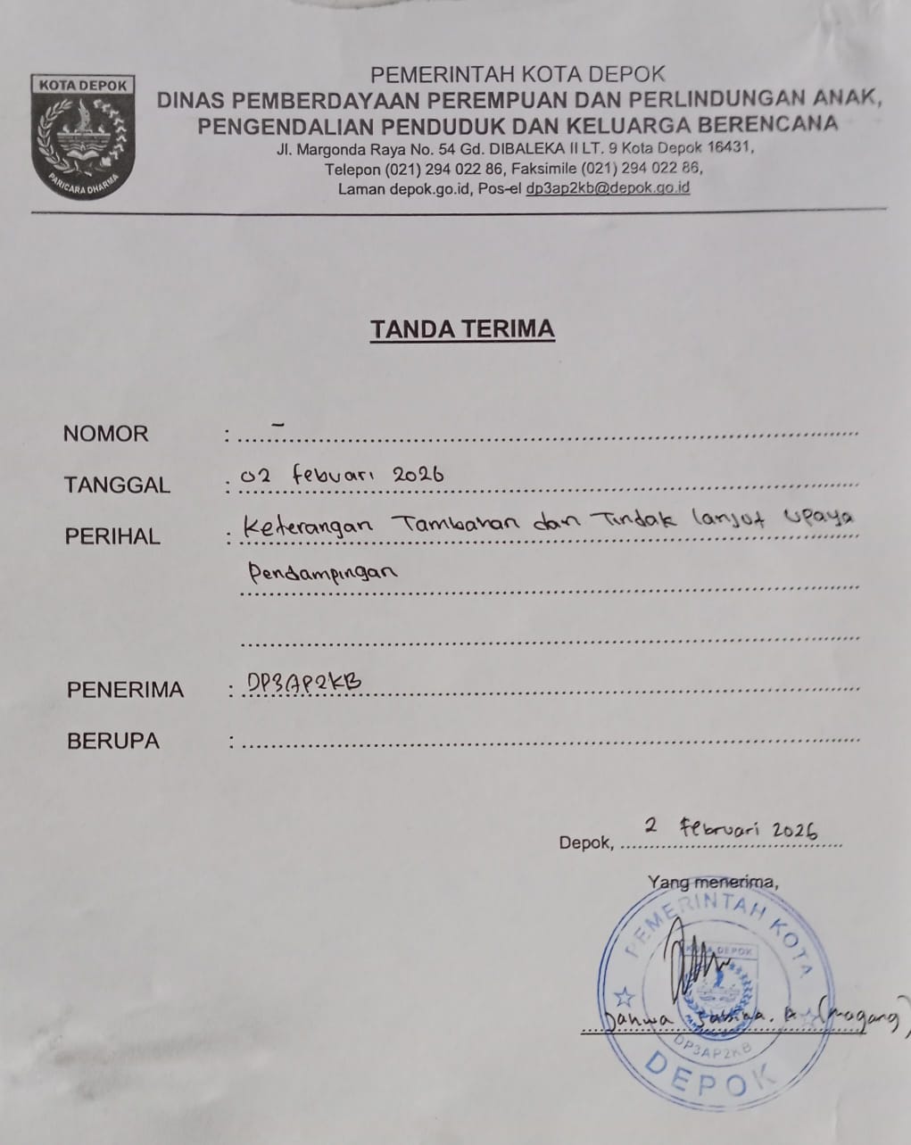 Saat ditemui, rekan korban menjelaskan bahwa korban telah mengirimkan surat perihal keterangan tambahan kepada Kadis DP3AP2KB Kota Depok, seraya menunjukkan bukti tanda terima, yang artinya, surat korban telah diterima oleh pihak dinas sesuai prosedur operasional standar administrasi pemerintahan.